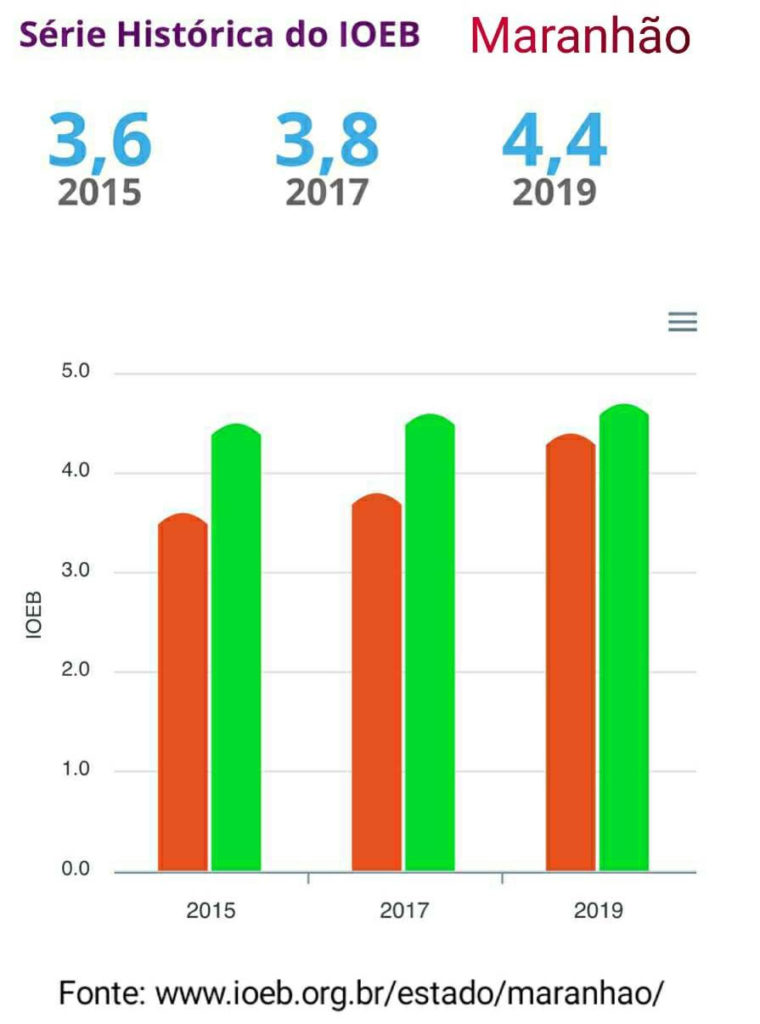 O Maranhão saltou de 3,6 em 2015 para 4,4 em 2019, segundo dados publicados no portal do IOEB (ioeb.org.br). A média maranhense coloca o estado à frente de outras unidades que recuaram no índice, tais como: Espírito Santo, cuja média caiu de 4,7 em 2015 para 4,0 em 2019; Ceará, que teve queda de 4,6 (2015) para 4,1 (2019), e Paraná, que caiu de 4,9 em 2015 para 4,2. Também diminuíram a média Goiás e Minas Gerais.