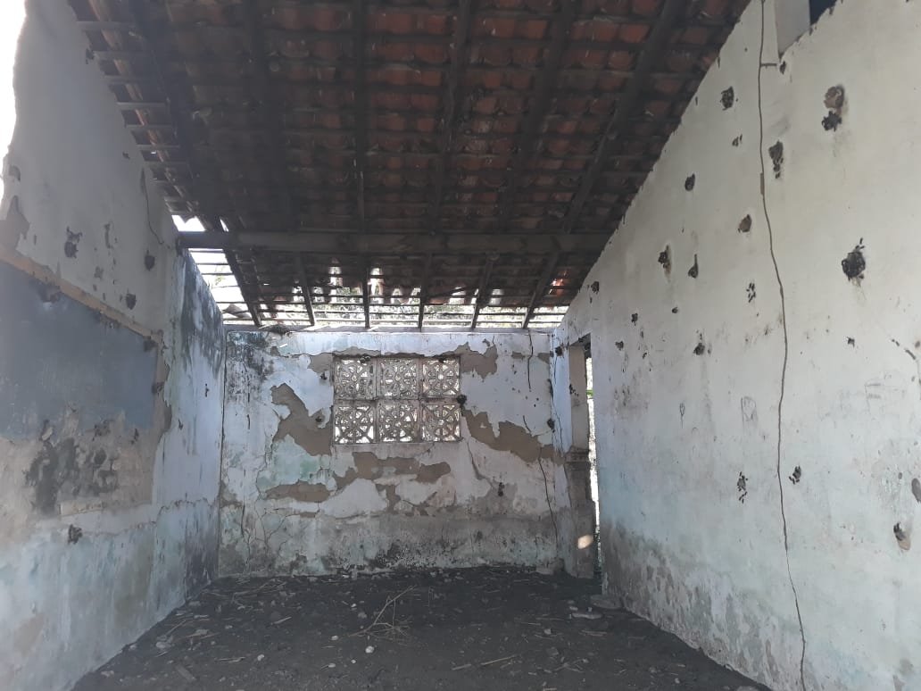 para esconder os buracos nas paredes precárias. O mato está invadindo os ambientes