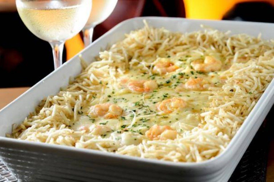 Em uma frigideira grande, bem aquecida, coloque um fio de azeite e doure os camarões, coloque uma pitada de sal para liberar os sabores, acrescente o requeijão, arroz, creme, ervilhas, presunto e muçarela ralada, mexa até que esteja cremoso e espesso, corrija o sal e a pimenta. Leve a uma travessa e cubra com a muçarela fatiada. Em seguida leve ao forno a 180º até que derreta. Cubra com batata palha e sirva imediatamente.