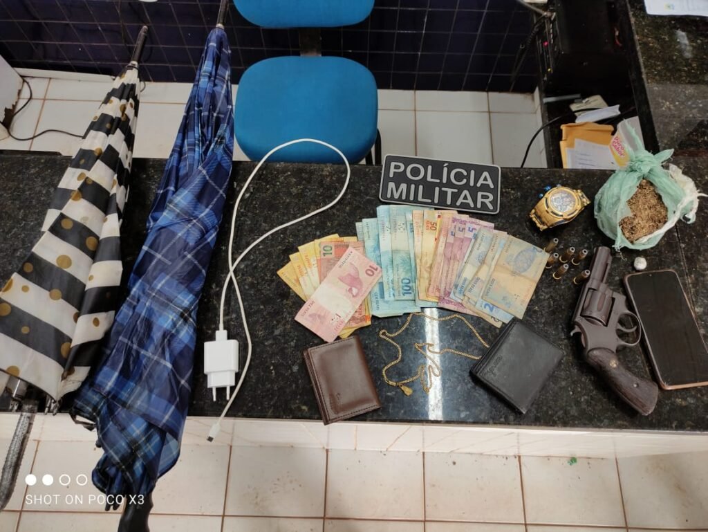 Ao realizar as buscas pessoais nos suspeitos, foram encontrados um revólver Taurus, calibre .38, municiado; R$ 926,00 em dinheiro; uma porção de aproximadamente 250 gramas de maconha; bijuterias e um celular.