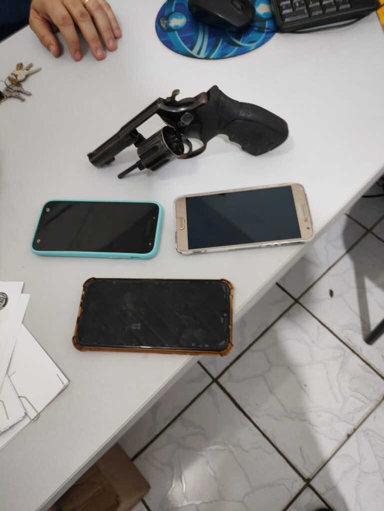 Durante buscas na residência da vítima, foram apreendidos um Honda Pop preta, tomada de assalto há uma semana, três aparelhos celulares com registro de roubo e também um revólver calibre 38 special utilizado no crime.