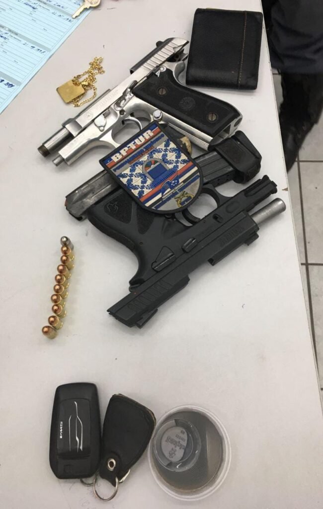 Eles estavam em uma Toyota SW4, cor preta, igualmente repassado às características da central. Ao revistar o veículo foram encontrados duas armas de fogo, do tipo pistola.