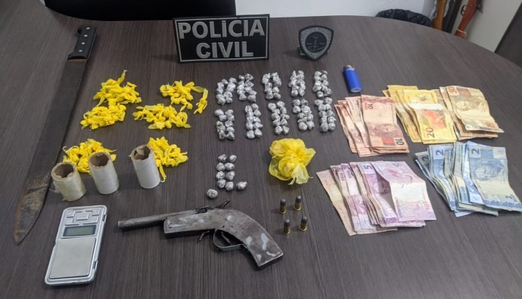 No imóvel foram apreendidos 1 arma de fogo, 4 munições calibre 38; 1 facão; 110 papelotes de maconha; 59 papelotes de cocaína, porções de crack; balança de precisão; papel filme e R$ 535,00 em espécie.