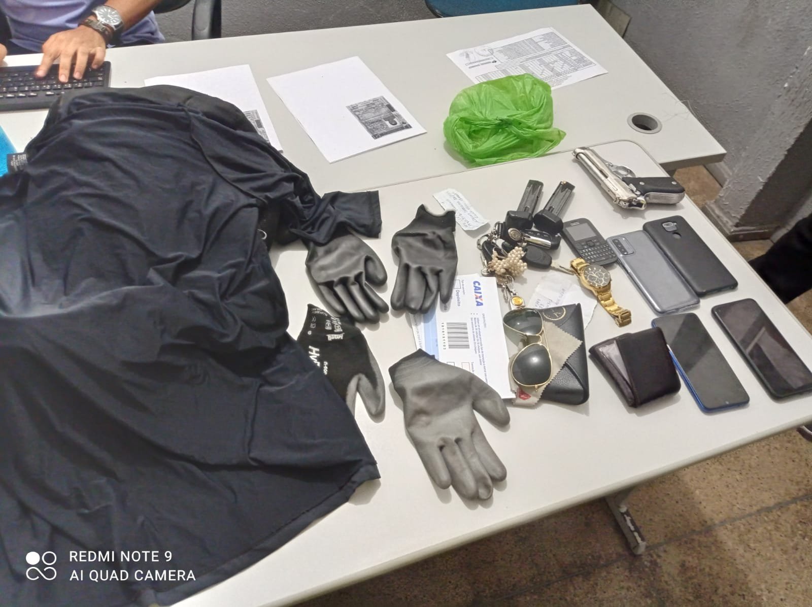 Durante a abordagem dos indivíduos, foram apreendidos uma pistola, dois veículos, luvas, e outros petrechos utilizados nos assaltos