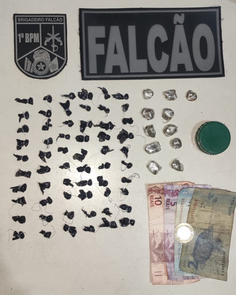 Após ser dado ordem de parada, o menor tentou se desfazer de um saco plástico contendo objetos ilícitos. Durante a revista pessoal e no recinto foram encontrados 11 invólucros de maconha, 60 invólucros de crack, uma pequena quantia em dinheiro e apetrechos para o tráfico.