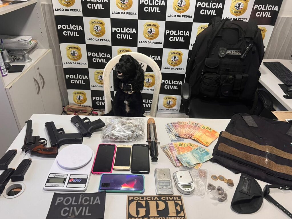 Durante o cumprimento aos mandados de busca em endereços no bairro Pimentel, os policiais conseguiram apreender um revólver, marca Taurus, calibre .38, devidamente municiado com cinco cartuchos; uma pistola, marca Taurus, calibre .40, devidamente municiada, além de dois carregadores municiados; um simulacro de pistola Glock; aproximadamente 130 porções de substâncias similares a maconha; uma pedra de substância similar a crack; balanças de precisão; cerca de 499 reais em espécie ; seis aparelhos celulares; várias notas promissórias e cartões bancários e um colete balístico.