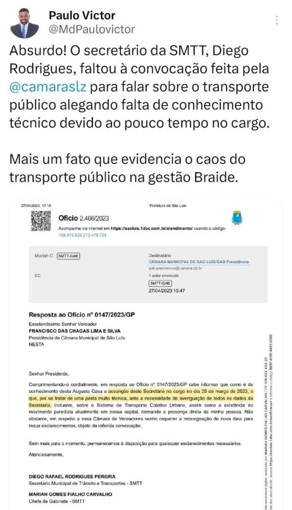 “Absurdo! O secretário da SMTT, Diego Rodrigues, faltou à convocação feita pela @camaraslz para falar sobre o transporte público alegando falta de conhecimento técnico devido ao pouco tempo no cargo. Mais um fato que evidencia o caos do transporte público na gestão Braide.” Criticou Victor.