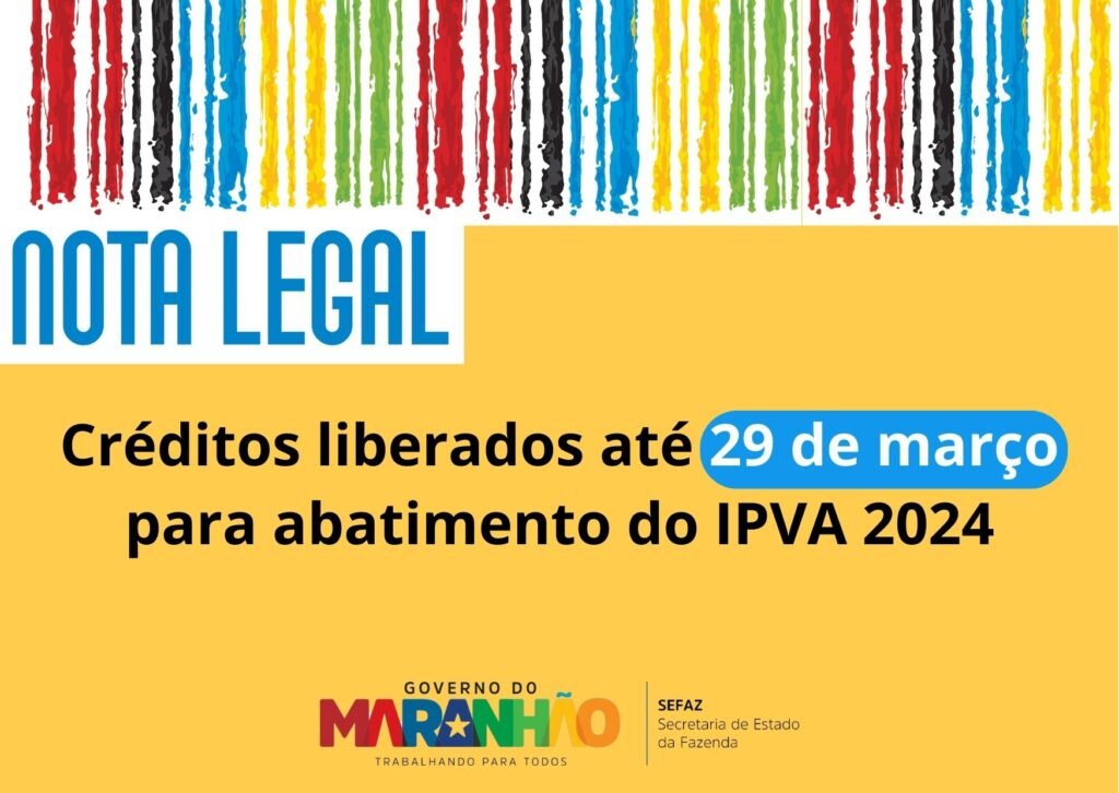 A Secretaria da Fazenda do Estado do Maranhão (Sefaz-MA) informa aos consumidores cadastrados no programa Nota Legal que liberou o módulo de resgate de créditos para abatimento do IPVA 2024. O resgate de créditos poderá ser feito até o dia 29 de março de 2024 e o valor a ser resgatado está limitado a até 50% do valor do Imposto Sobre a Propriedade de Veículos Automotores (IPVA).