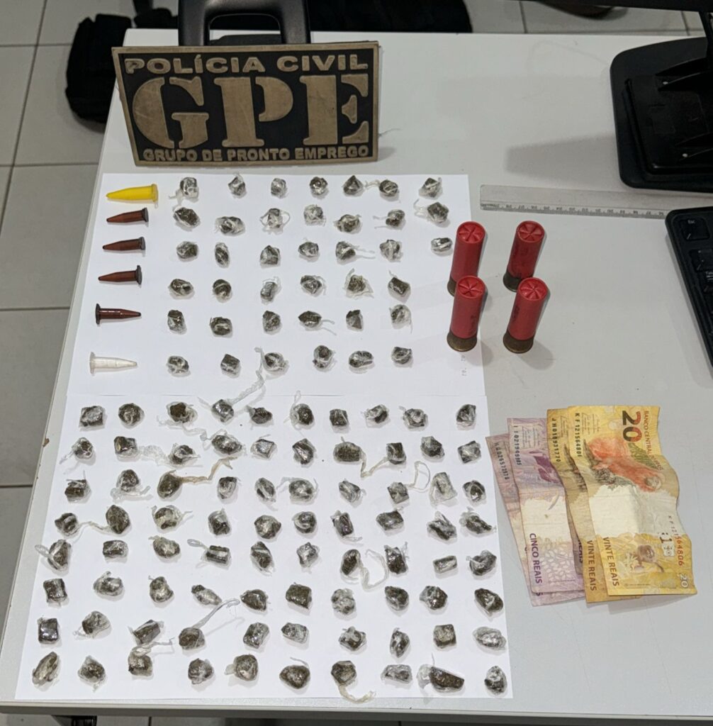 No interior da residência do investigado, a Polícia Civil encontrou 162g de maconha, dividida em grandes porções, bem como 119 porções individuais do mesmo entorpecente, todas embaladas e prontas para a comercialização ilegal do tráfico de drogas, além de 10g de cocaína, 6 “pinos” da mesma droga, balança de precisão, dinheiro dividido em cédulas de pequeno valor e 04 munições de espingarda calibre 12.