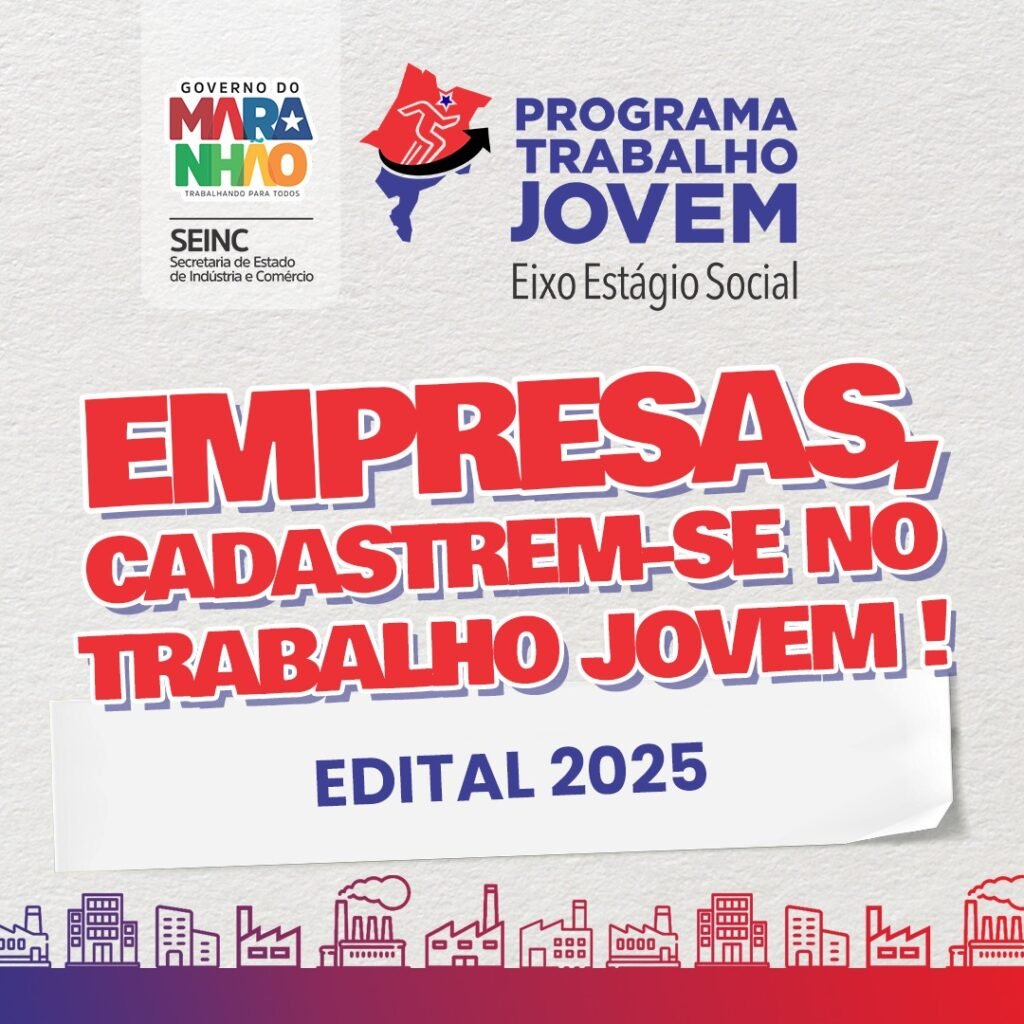 O Governo do Maranhão, através da Secretaria de Indústria e Comércio, abriu edital para credenciamento de empresas para o eixo Estágio Social do Programa Trabalho Jovem 2025. O edital é voltado a empresas que queiram ampliar seu quadro de colaboradores, através da contratação de estagiários do banco de cadastro do Trabalho Jovem.