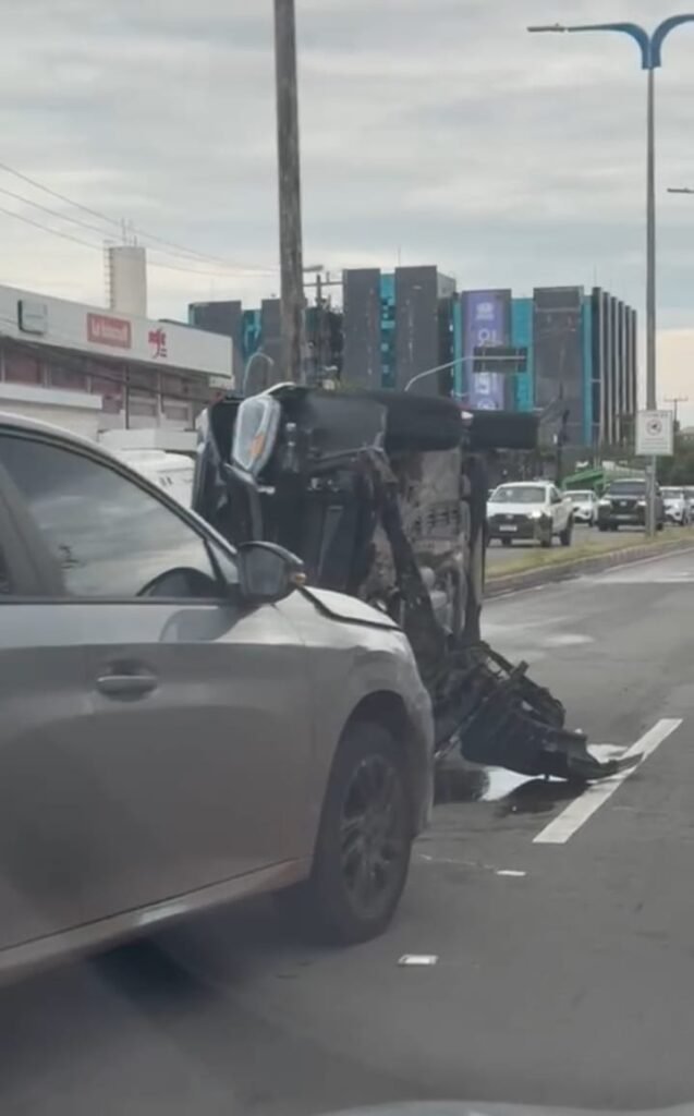 Com o forte impacto, um dos carros chegou a ficar parcialmente capotado na via, chamando a atenção de motoristas e pedestres que passavam pelo local. Apesar da gravidade aparente, não houve registro de feridos graves.