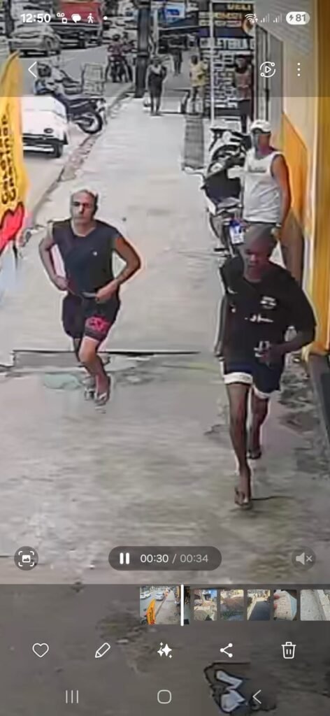 Imagens de câmeras de segurança registraram o momento em que dois criminosos, agindo de forma coordenada, abordam a vítima em plena luz do dia. Um dos assaltantes apontou a arma para o homem, enquanto o comparsa recolhe o celular e outros pertences. Em seguida, a dupla foge correndo do local.