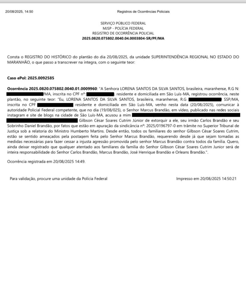 Lorena denuncia que a família Brandão estaria se utilizando de todo o aparato governamental mídia, forças de segurança e estruturas institucionais para tentar desmoralizar e sufocar a família de Gilbson Cutrim, inclusive por meio de mandados de busca por supostos pendrives com materiais comprometendo os Brandão, há um tempo atrás.