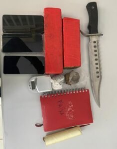 2 tabletes de substância vegetal análoga à maconha, embalados em fita plástica vermelha; 2 porções avulsas da mesma substância, acondicionadas em saco plástico branco; 1 balança de precisão prateada; 1 mochila da marca Karga; 1 celular Redmi verde; 1 celular Samsung branco; 1 celular Motorola com capa metalizada; 1 faca de lâmina pontiaguda com cabo preto.