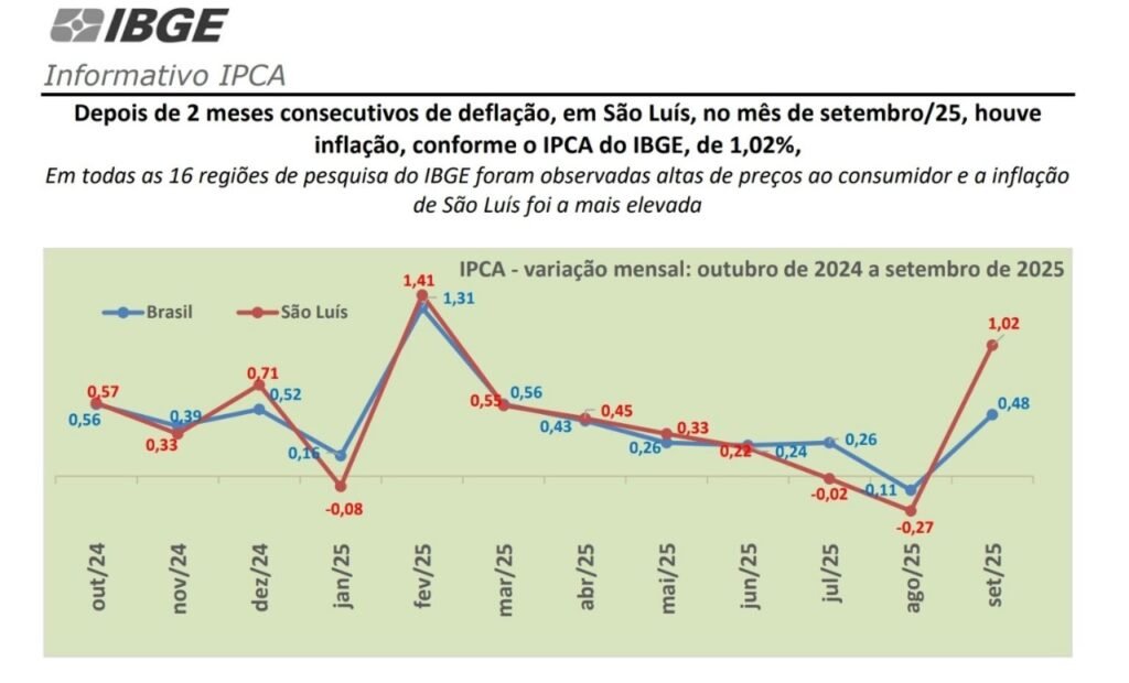 No acumulado de 2025, a inflação da capital maranhense subiu de 2,60% em agosto para 3,65% em setembro, superando a média nacional (3,64%). Em 12 meses, o IPCA de São Luís atingiu 5,32%, acima do teto da meta inflacionária de 4,5% fixada pelo Conselho Monetário Nacional. Desde junho, a cidade mantém inflação acima desse limite.