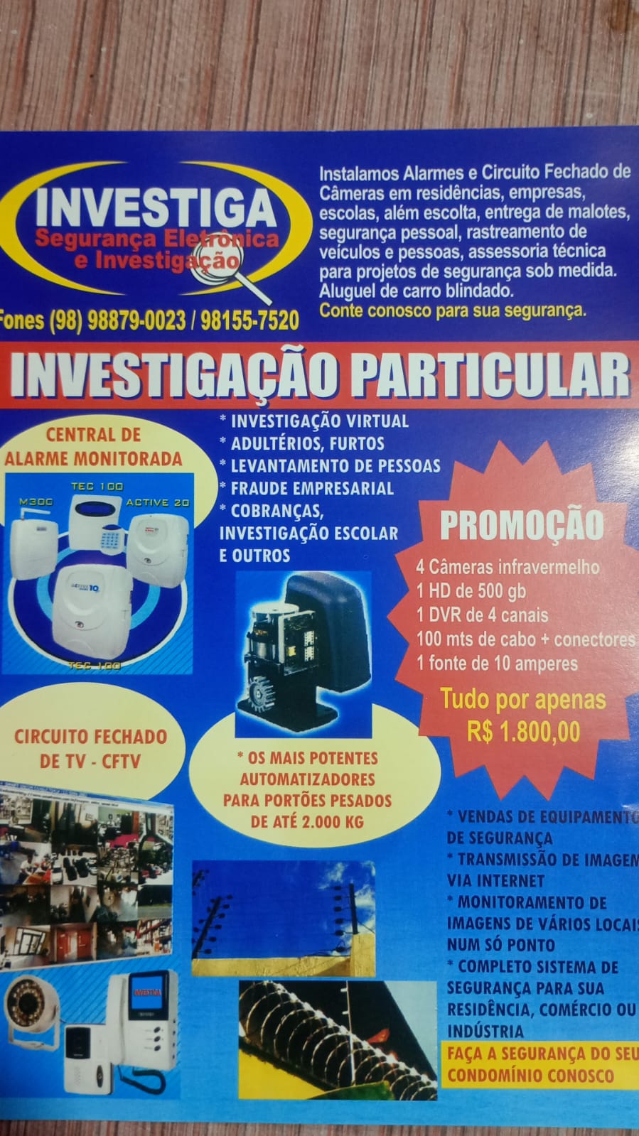 A empresa também atua na instalação de sistemas de alarme e circuito fechado de câmeras (CFTV) para residências, empresas e escolas. Além disso, oferece serviços especializados como escolta, entrega de malotes, segurança pessoal, rastreamento de veículos e pessoas, além de assessoria técnica para projetos de segurança personalizados. A Investiga ainda disponibiliza aluguel de veículos blindados.