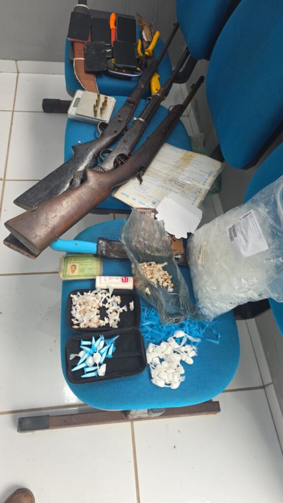 Durante a operação, foram apreendidas porções de crack, cocaína e maconha, além de armas de fabricação artesanal, munições, balança de precisão, dinheiro em espécie, celulares e materiais usados para embalar drogas.