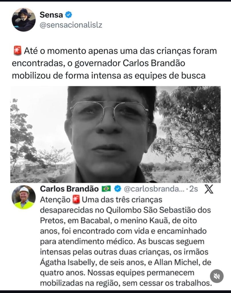 Para agravar ainda mais o cenário de descontrole administrativo, o comandante do Corpo de Bombeiros do Maranhão, Célio Roberto, divulgou um vídeo afirmando que as três crianças haviam sido localizadas. A informação, no entanto, não procede. Apenas uma criança foi encontrada: o menino Kauã, de 8 anos. As outras duas, Agatha Isabelly, de 6 anos, e Allan Michael, de 4, continuam desaparecidas.