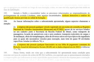 Segundo o relatório, como a subcontratada foi apresentada para executar serviços no valor de R$ 24,2 milhões, era esperado que fossem apresentados atestados e comprovações que demonstrassem capacidade técnica e operacional, conforme determina o art. 122, §1º, da Lei nº 14.133/2021 — o que não ocorreu.