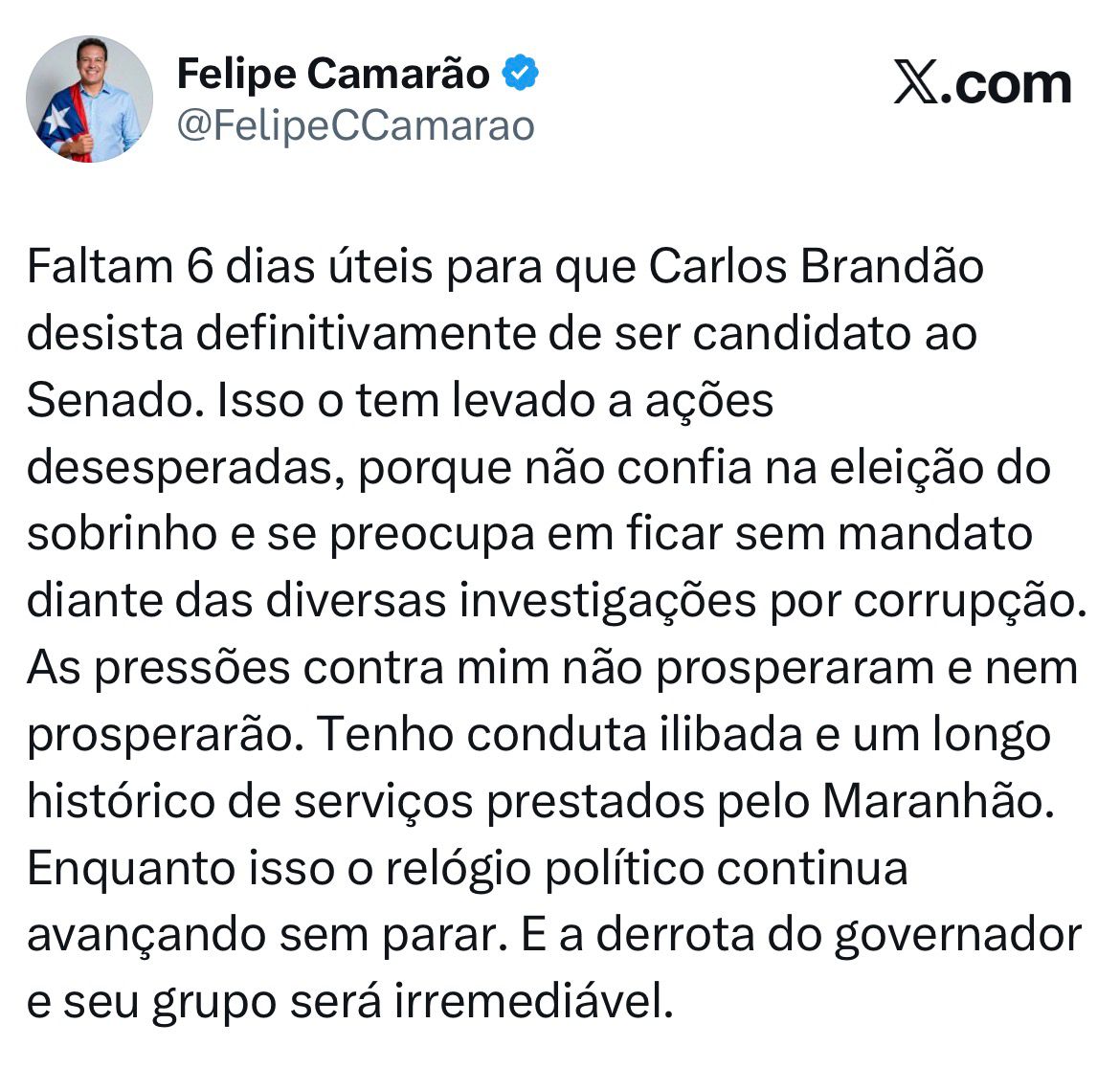 Nas redes sociais, Felipe Camarão destacou que o oligarca Brandão estaria correndo contra o tempo, já que faltam poucos dias para ficar impedido de disputar o cargo de senador. Camarão frisou ainda que Brandão e seus aliados têm adotado ações consideradas desesperadas. Segundo ele, o desespero se dá porque o governador tem ciência de que pode ficar sem mandato e não confia no projeto político do sobrinho.
