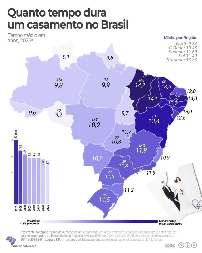 Um levantamento sobre a longevidade das uniões civis no Brasil aponta o Maranhão como o estado com maior duração média de casamentos antes do divórcio. Segundo os dados, as uniões no estado duram, em média, 14,2 anos, colocando-o à frente de estados como Piauí (14,1 anos) e Paraíba (14 anos). O resultado reforça o destaque da região Nordeste, que concentra os índices mais elevados do país.