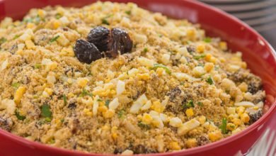 Ingredientes: 1 pacote (500 g) de farofa pronta 1 xícara de ameixas pretas secas sem caroço 5 colheres (sopa) de…