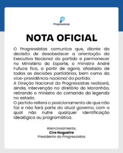 O senador também anunciou intervenção no diretório estadual do Maranhão, retirando Fufuca do comando local da legenda. “A Direção Nacional do Progressistas realizará intervenção no diretório do Maranhão, retirando o ministro do comando da legenda no estado. O PP não faz parte do atual governo, com o qual não tem identificação ideológica ou programática”, declarou Nogueira.