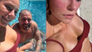 Paolla Oliveira posa de biquíni vermelho e sem filtro ao lado de Diogo Nogueira